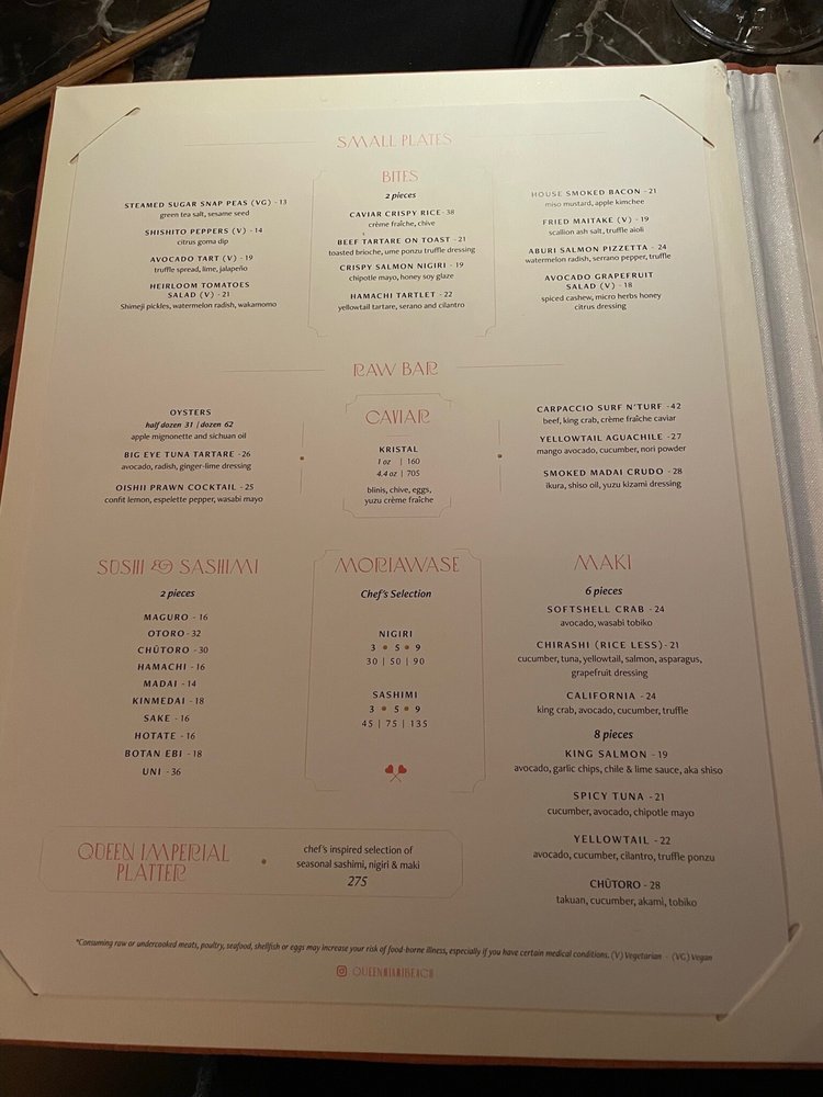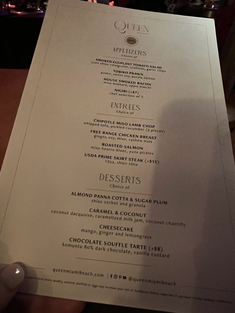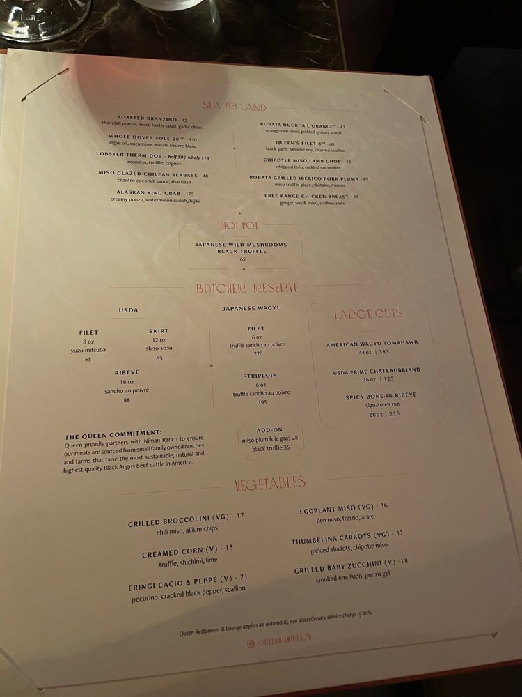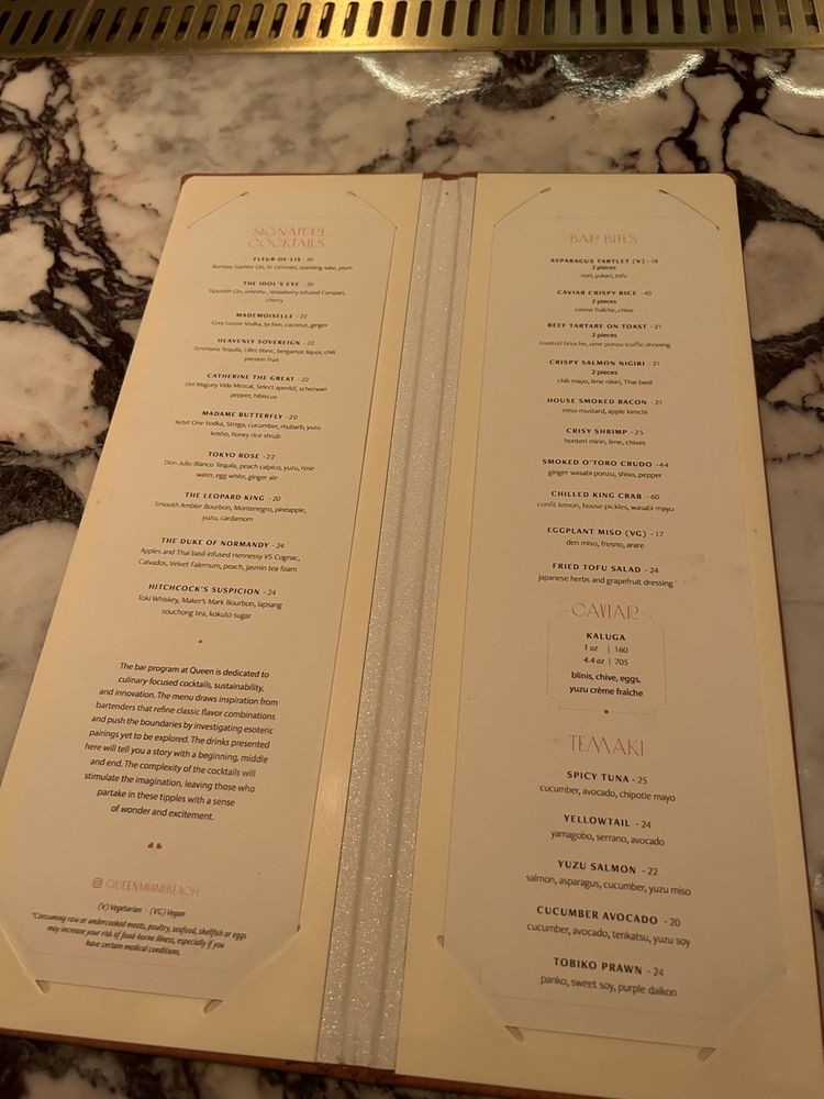 Introducing the menu at Queen Miami Beach: This upscale lounge and sushi bar in Miami Beach offers a luxurious dining experience with a blend of Japanese cuisine. The menu features dishes like hamachi tartlet, sea bass tempura, skirt steak, roasted cauliflower, signature sushi rolls, and more. The food is fresh, well-seasoned, and delicious. Guests rave about the elegant decor, friendly staff, entertaining shows featuring saxophone music, acrobatics, and more. While the prices are on the higher end, the overall experience of dining at Queen Miami Beach is described as unforgettable and worth the splurge. The cocktails are expertly crafted, the staff is attentive, and the atmosphere is glamorous and opulent. If you're looking for a unique dining experience in Miami Beach, Queen Miami Beach is a must-visit.